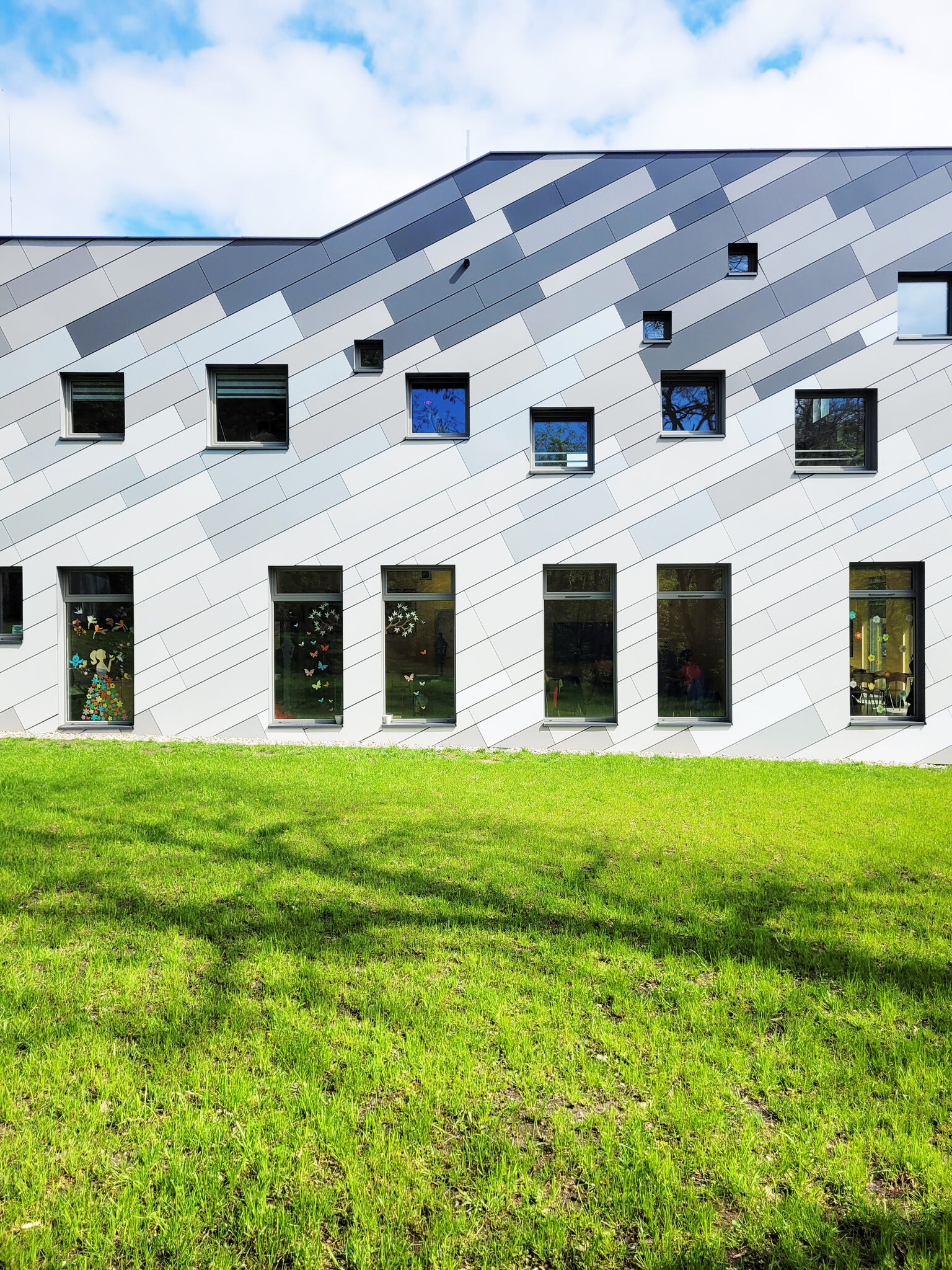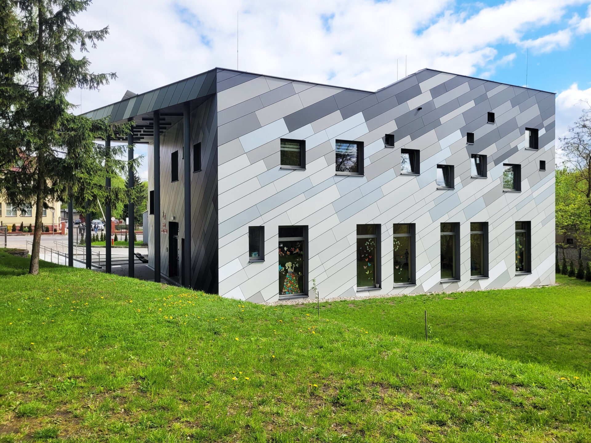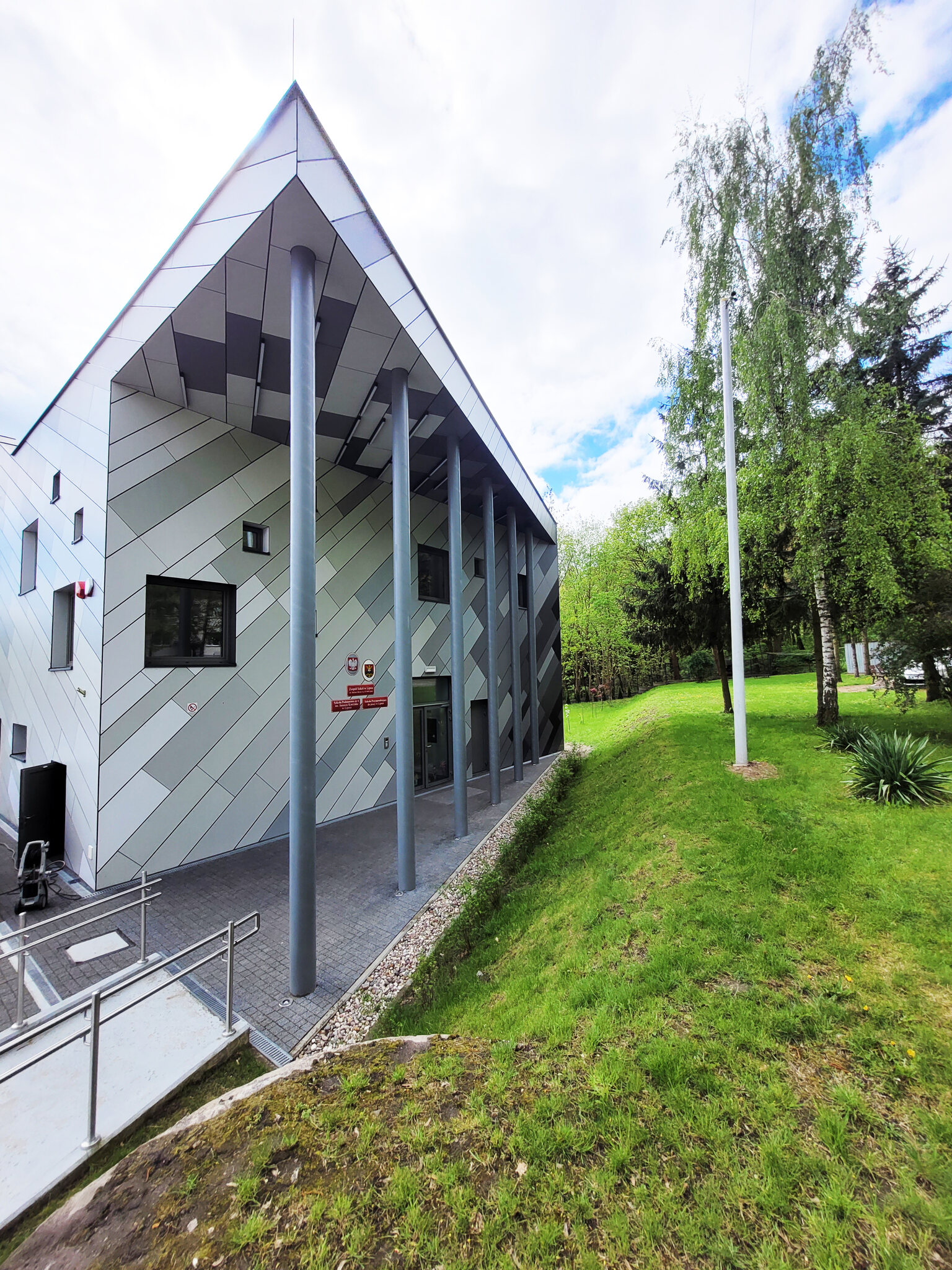 Budynek Szkoły Specjalnej w Lipnie to nowoczesny obiekt edukacyjny. Szkoła jest energooszczędna i korzysta z odnawialnych źródeł energii. Obiekt wyposażono w panele fotowoltaiczne, pompę ciepła, zbiornik retencyjny na wodę deszczową z odzyskiem wody szarej do spłuczek. Budynek zaprojektowano jako dwukondygnacyjny, niepodpiwniczony, kryty dachem płaskim o nachyleniu 2% podzielonym na dwie połacie, znajdujące się na różnych wysokościach. Rzut budynku jest na planie prostokąta. Przed wejściem do budynku projektuje się zadaszenie, stanowiące przedłużenie połaci dachowej na planie trójkąta. Finalna bryła budynku jest nowoczesna i dynamiczna. Elewację zaprojektowano parametrycznie z płyt HPL.